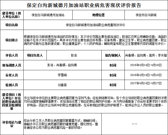 保定白沟新城德月加油站职业病危害现状评价