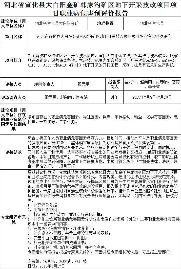 河北省宣化大白阳金矿韩家沟矿区地下开采技改项目职业病危害预评价